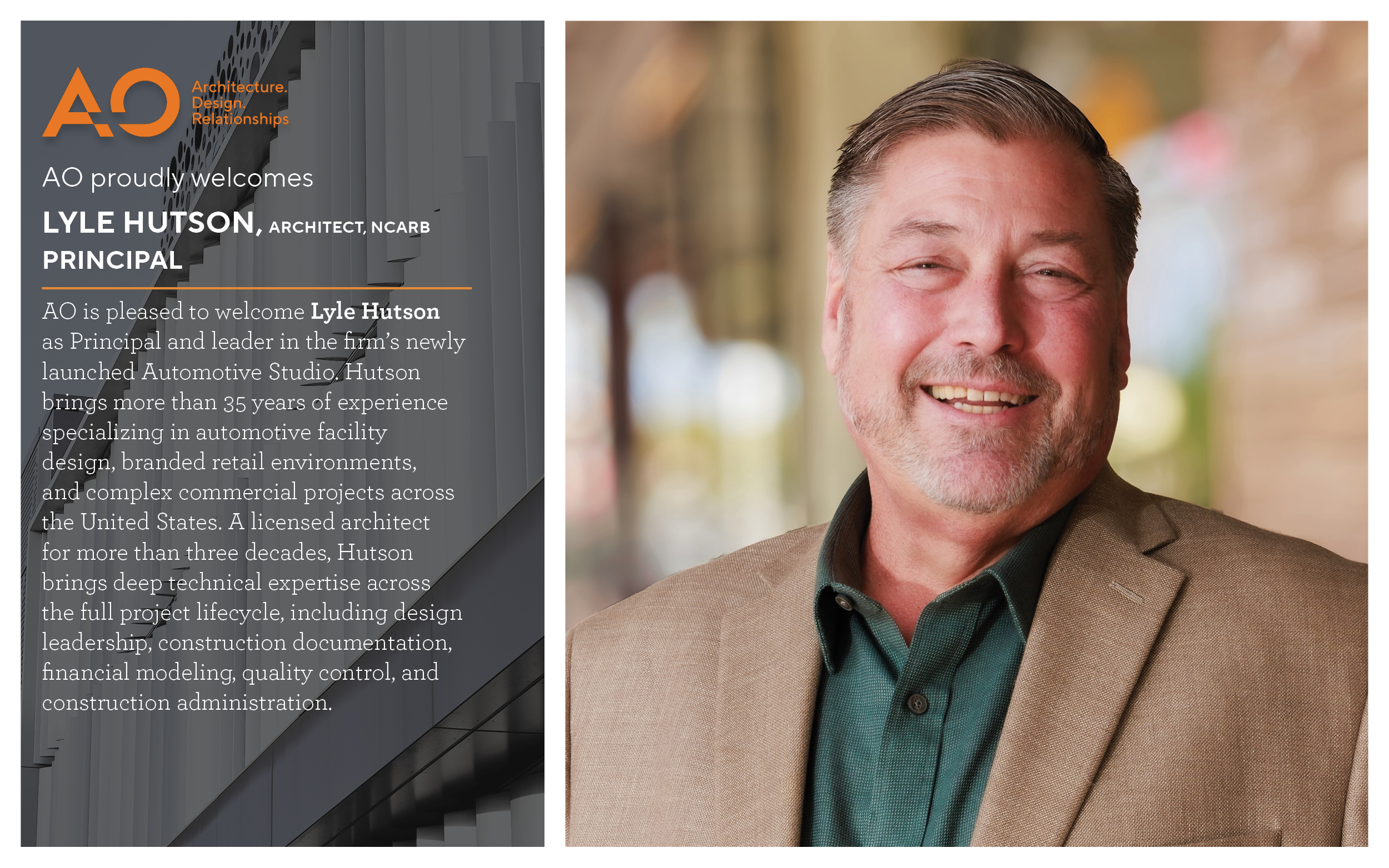 AO is pleased to welcome Lyle Hutson as Principal and leader in the firm's newly launched Automotive Studio. Hutson brings more than 35 years of experience specializing in automotive facility design, branded retail environments, and complex commercial projects across the United States.