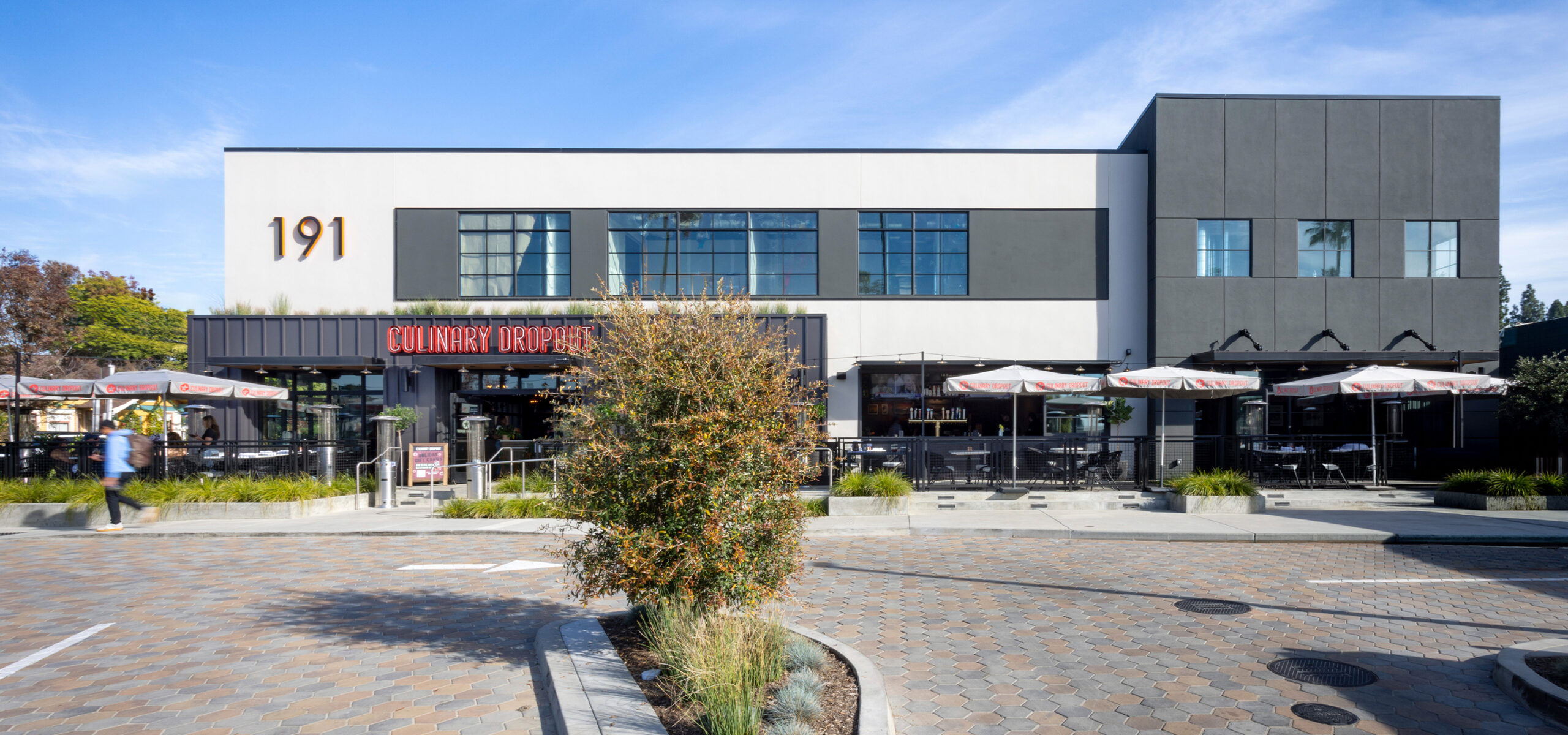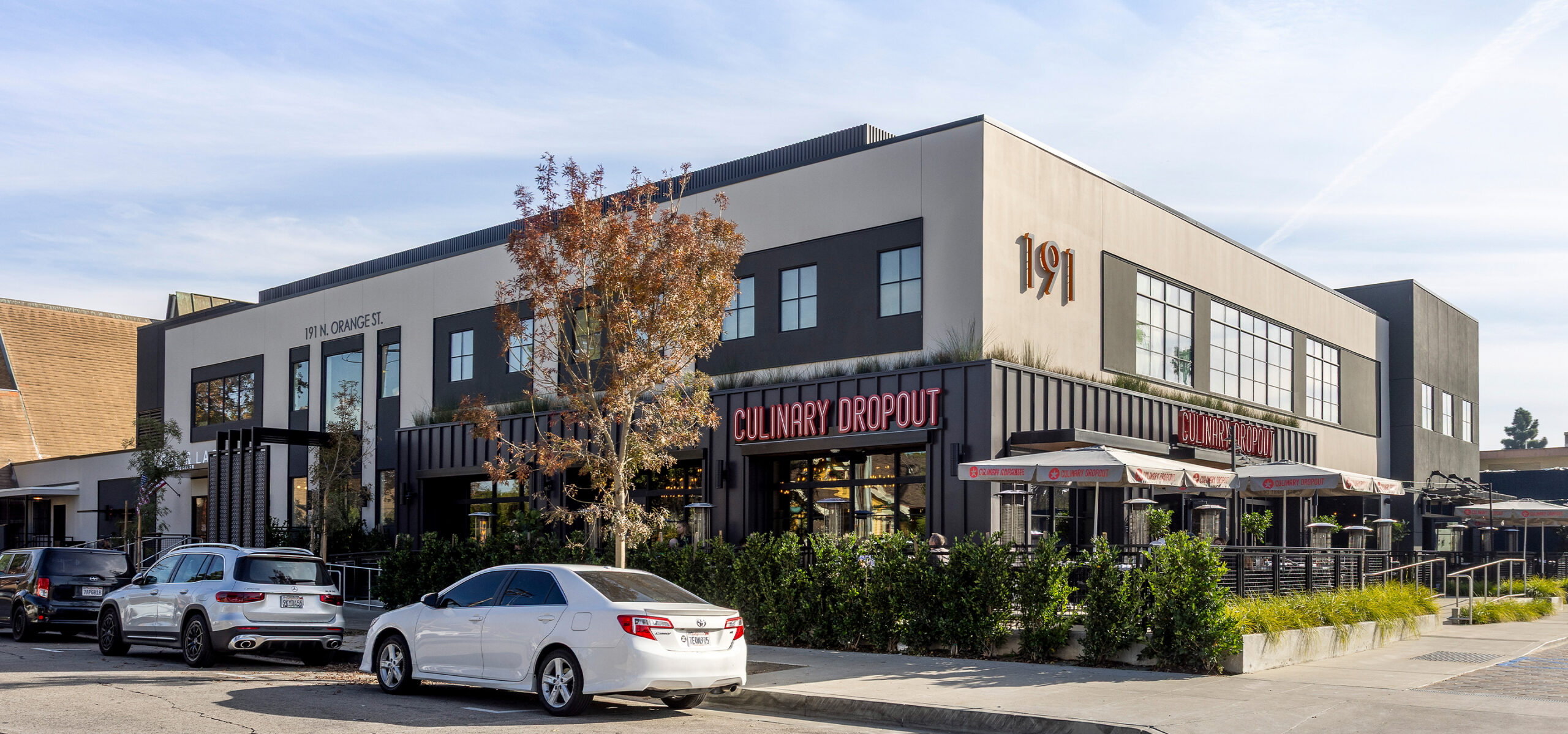 The ground floor now features Culinary Dropout, a lively dining destination, and Love and Lace, a boutique bridal shop, both fronting a small parking area and welcoming guests through a shared lobby entry. Office spaces occupy the upper level, with all environments connected by a dramatic two-story common lobby that serves as a central gathering point and includes potential amenity areas.