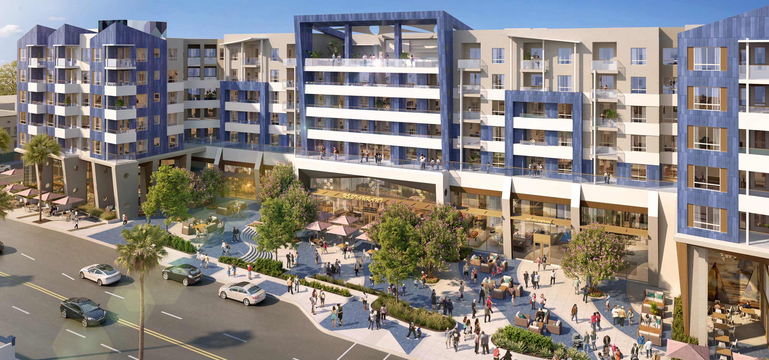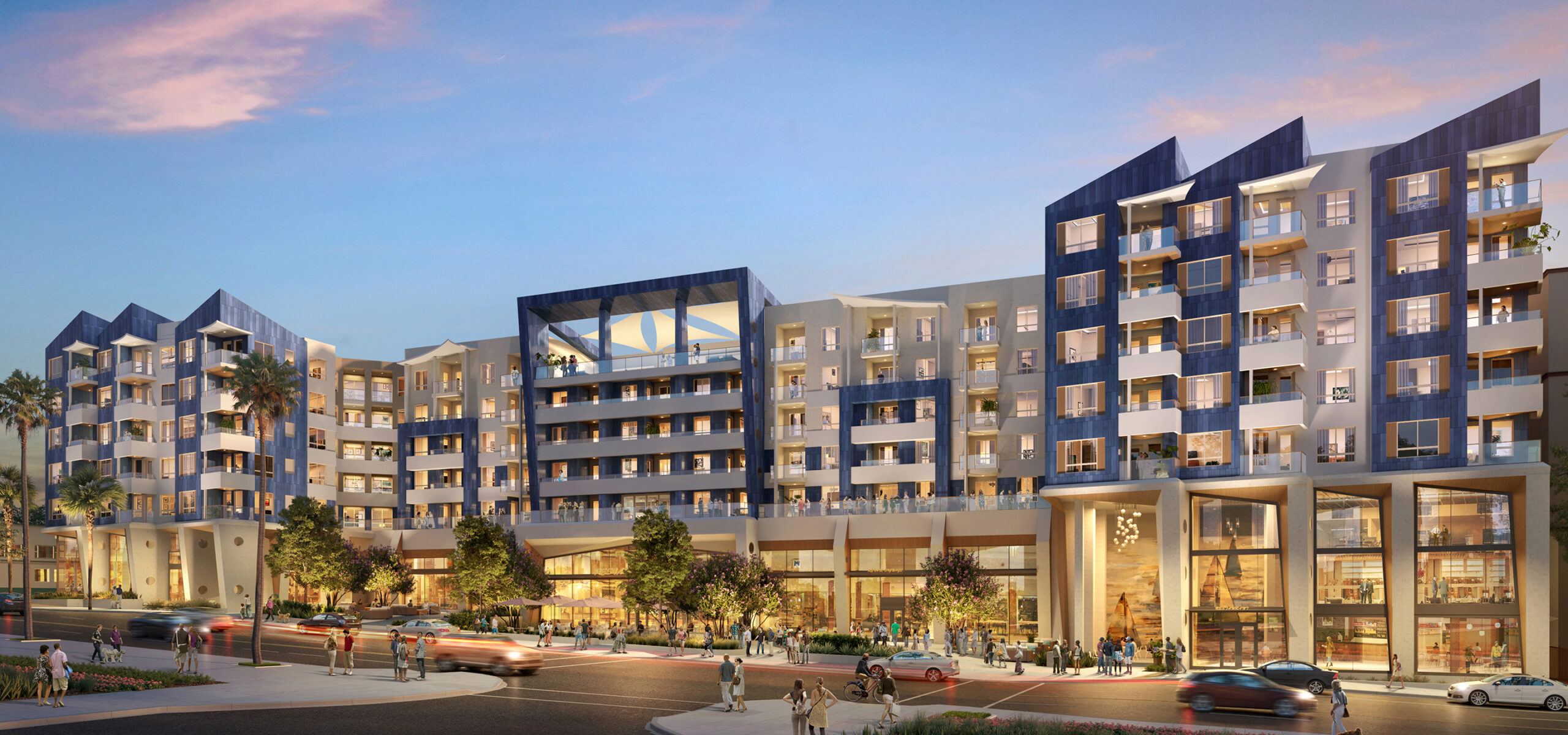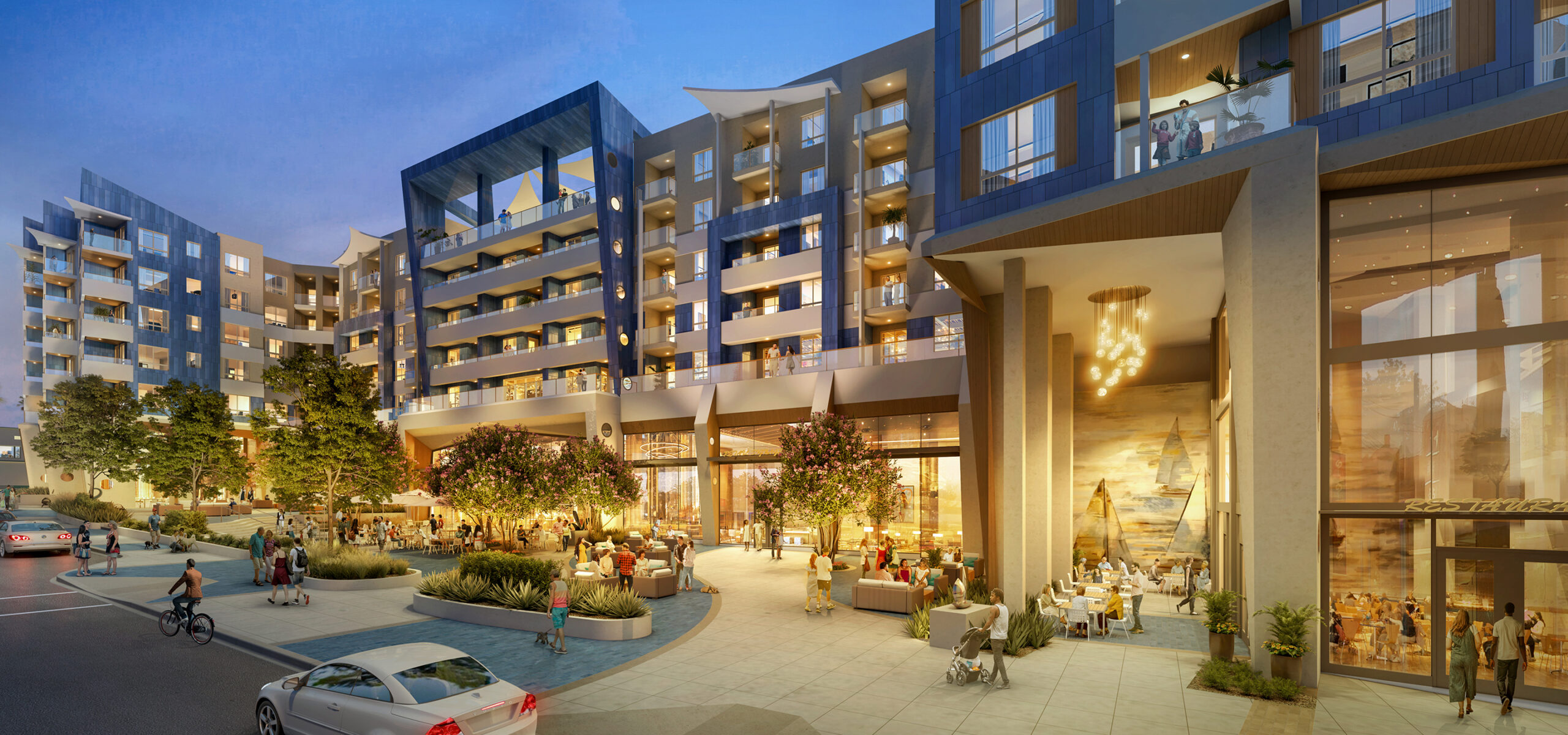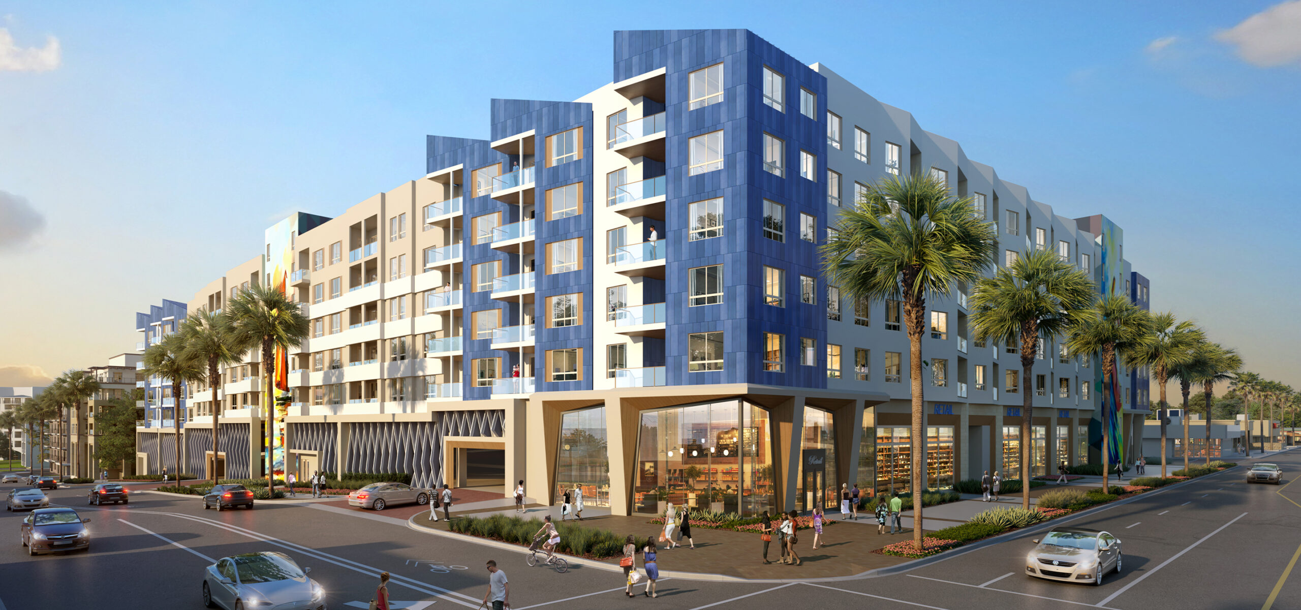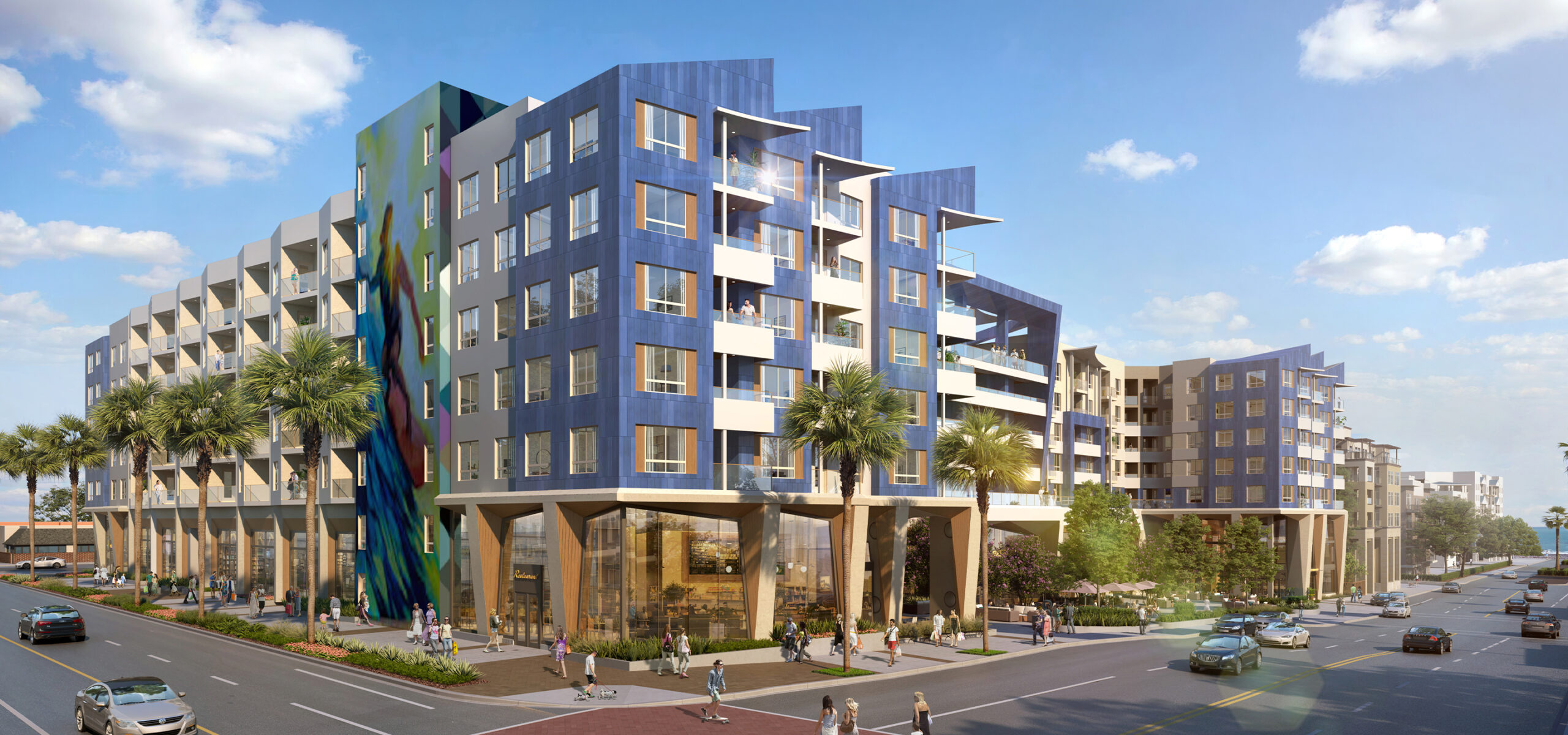 This transformative project aligns with the City’s mission to establish downtown Oceanside as a premier destination for business, recreation, tourism, entertainment, housing, and the arts. As personified by the maritime setting, the 5-over-3 podium building will fuse surf culture and the arts harmoniously with an urban environment, contributing 326 market-rate apartments and almost 26,490 square feet of double-volume retail, restaurants, and outdoor plazas on the ground floor. Large murals and a natural mix of glass, stucco, metal, and concrete materials encompass the façade creating visual interest and alluding to the native textures of the coast.
