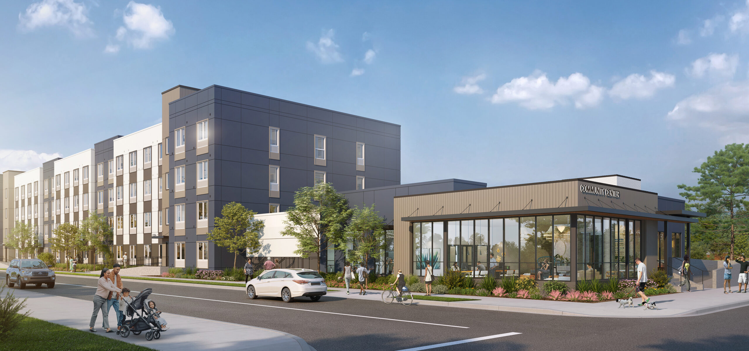 This Fresno community introduces a modern lifestyle with 54 affordable units in a four-story garden walk-up built using modular prefabrication for efficiency and sustainability. Ground-level spaces along Cesar Chavez Boulevard include an 850 sq. ft. community room, a welcoming entry lobby, and leasing offices with meeting areas. Outdoors, a 6,586 sq. ft. playground and picnic zone encourage connection and physical activity, designed by AO’s landscape studio. The community also offers bike storage and laundry rooms on each floor. Cool tones, contemporary finishes, and thoughtful amenities set the stage for future phases, creating a vibrant, inclusive neighborhood.