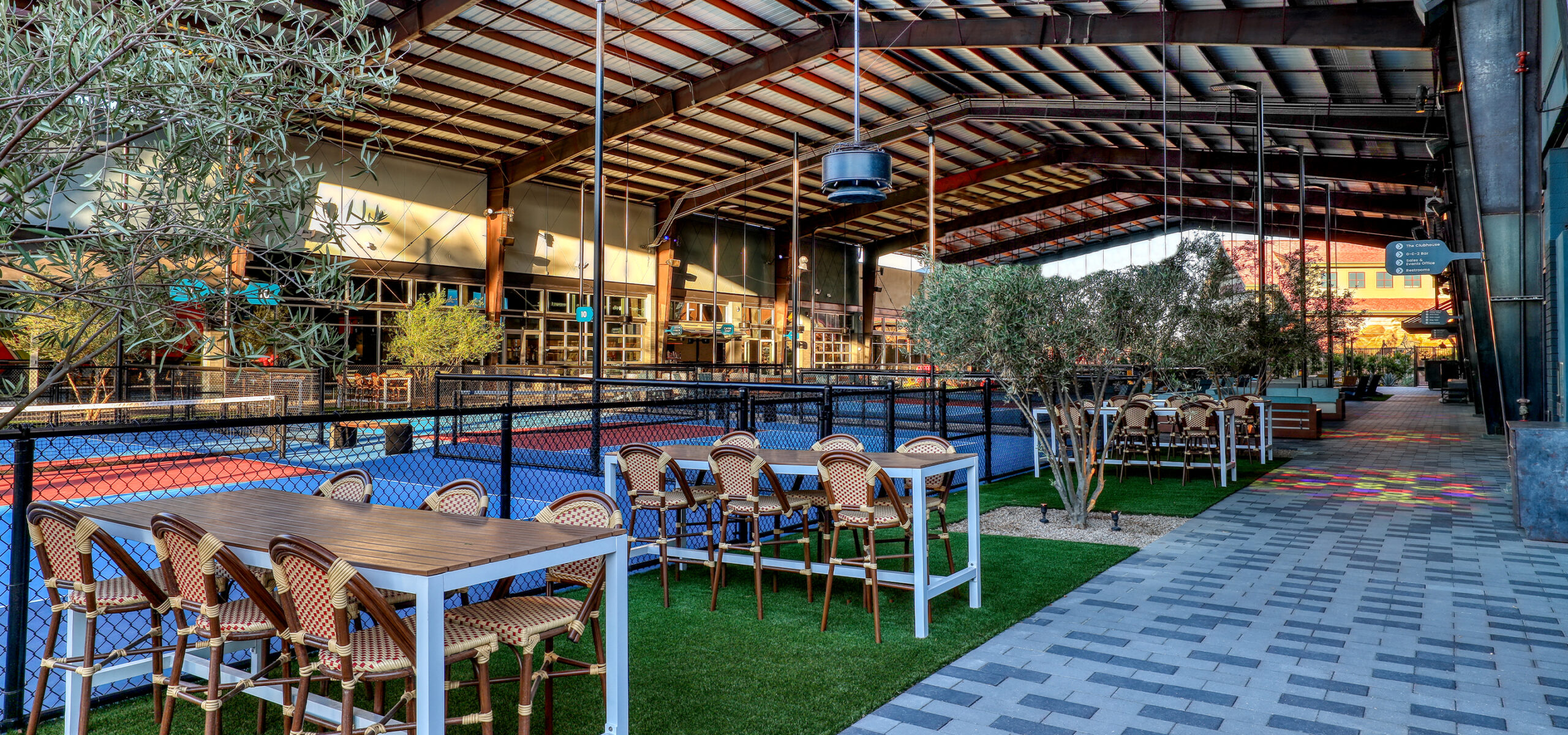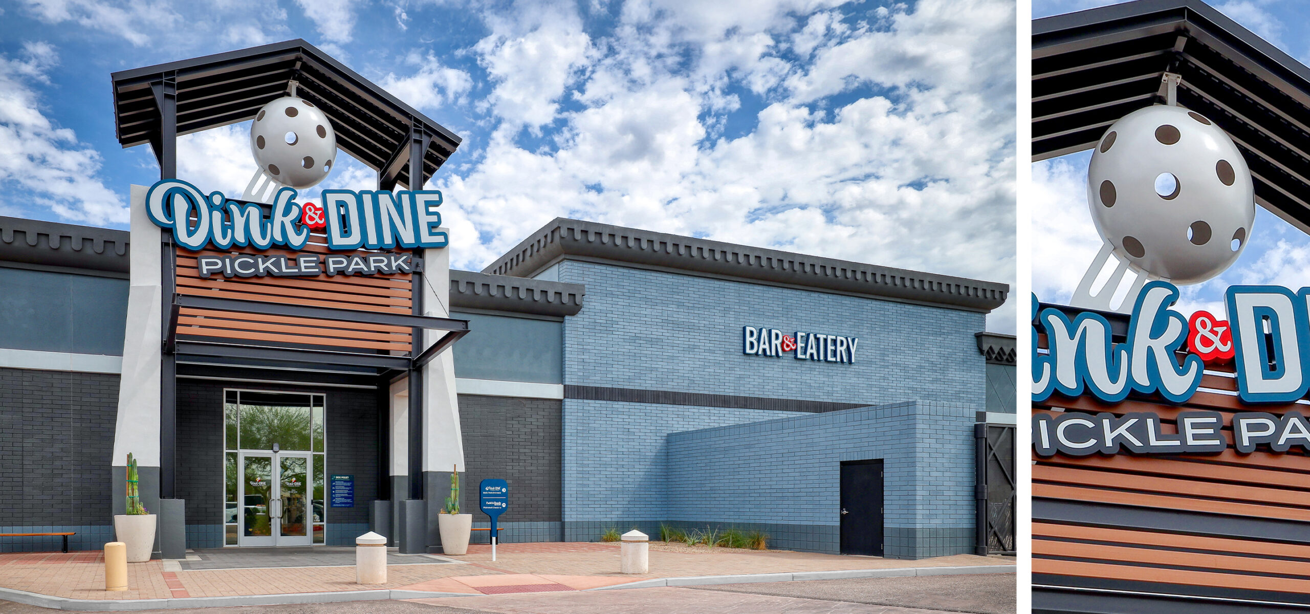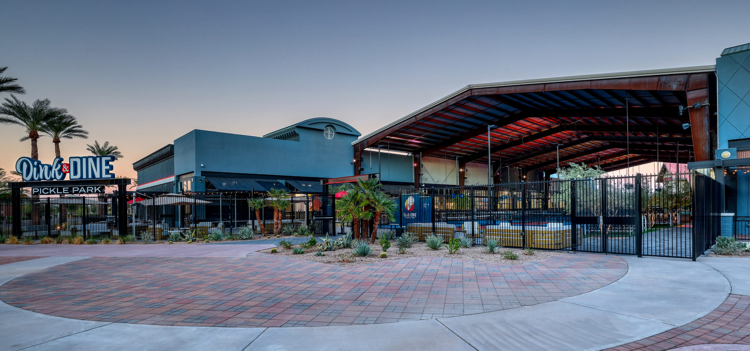 Dink & Dine Pickle Park sets the stage for a pioneering era in ‘sportstainment,’ seamlessly blending play, entertainment, and refined culinary experiences. Nestled in Mesa, AZ, this newly adapted complex spans 63,000 square feet, boasting both indoor and outdoor pickleball courts, a dedicated dog park, a food hall, bars, expansive event spaces, and a live entertainment arena. The architectural design of the facility is both elegant and timeless, featuring an iconic grand entrance and an open-concept layout within a welcoming, family-friendly atmosphere. This meticulously crafted space transcends traditional recreation, offering a harmonious convergence of sports, culinary exploration, and entertainment. This development is poised to become a cornerstone in the community, providing a dynamic and vibrant community destination.