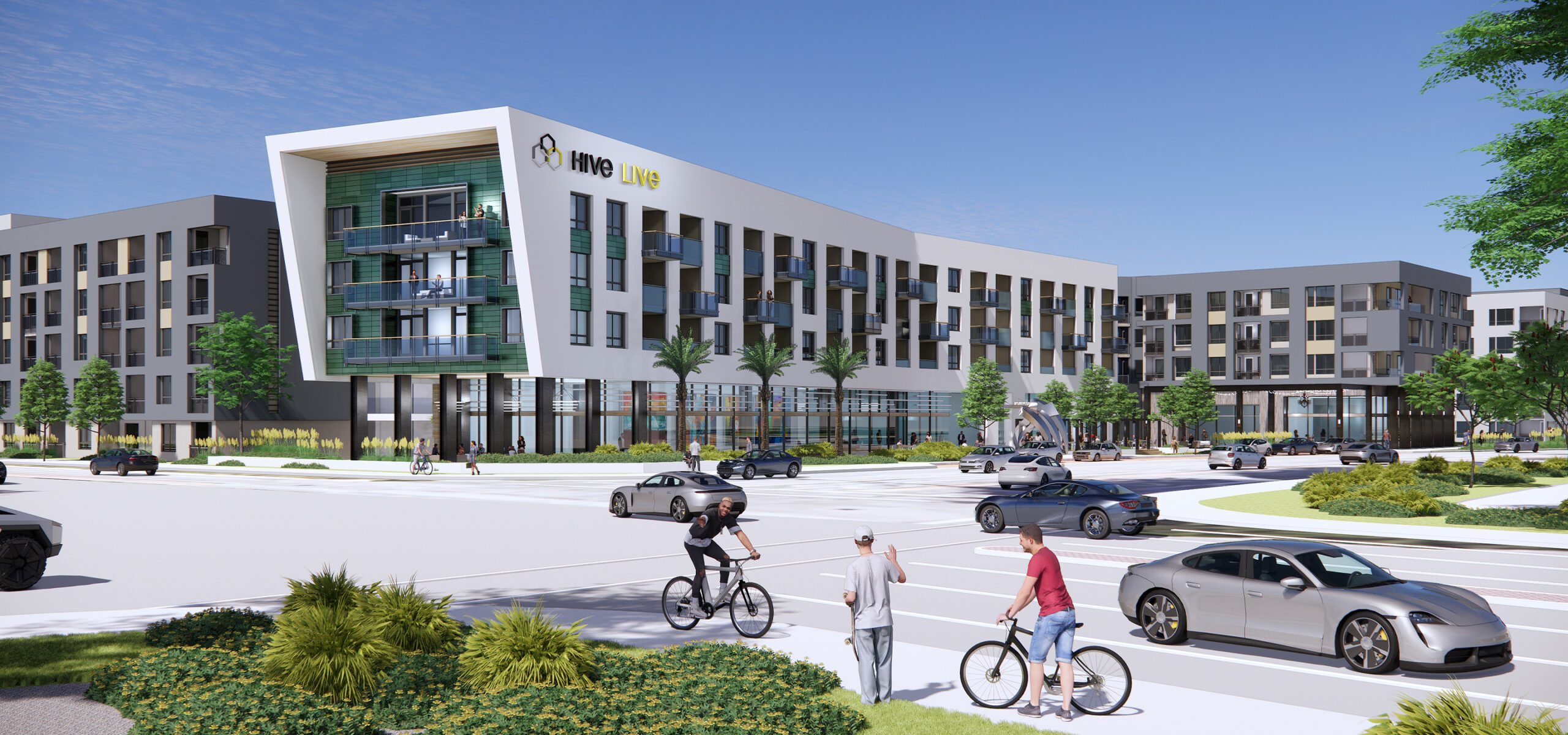 Hive Live embodies the convergence of art, community, and culture, deeply rooted in Costa Mesa’s dynamic heritage while redefining urban living across its expansive 14.25-acre canvas. Sited on the former NFL Charger’s practice facility, the new community is centrally located adjacent to Costa Mesa’s world-class arts, shopping, and fashion districts. Comprising 1,050 units across three distinct phases—The Innovator, The Explorer, and The Eco-Enthusiast—HIVE LIVE exemplifies thoughtful design and contextual sensitivity. Amenities are situated along internal public paseos that seamlessly connect to an open trail system. Open courtyards highlight indoor/outdoor recreation spaces featuring pickleball courts, cornhole, and lawn games.