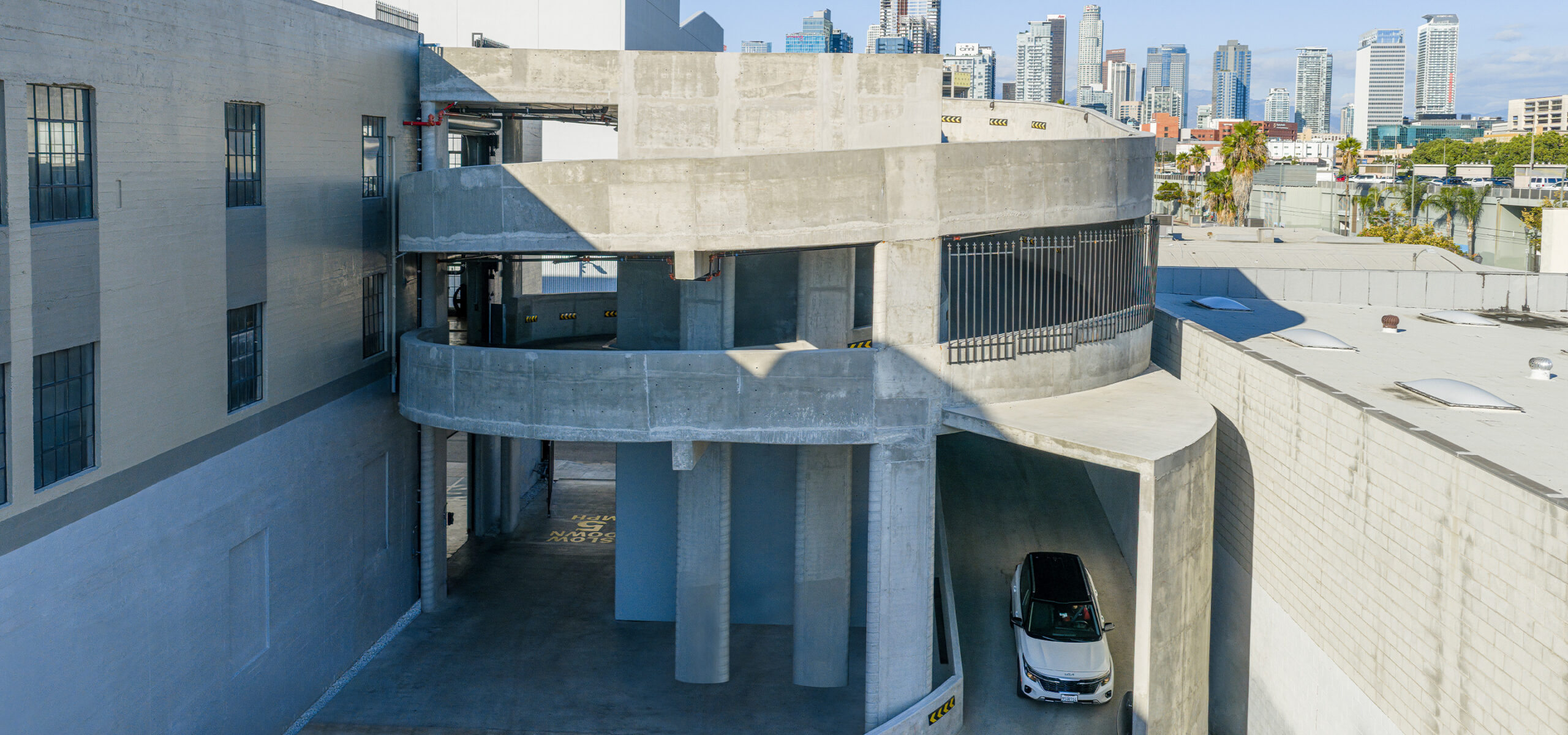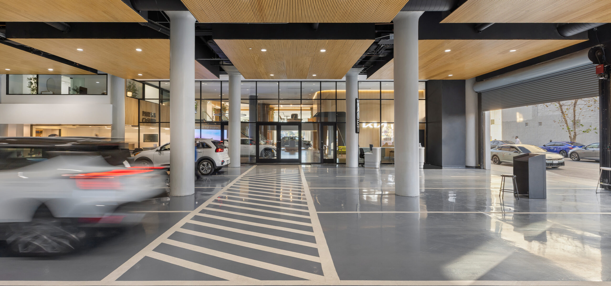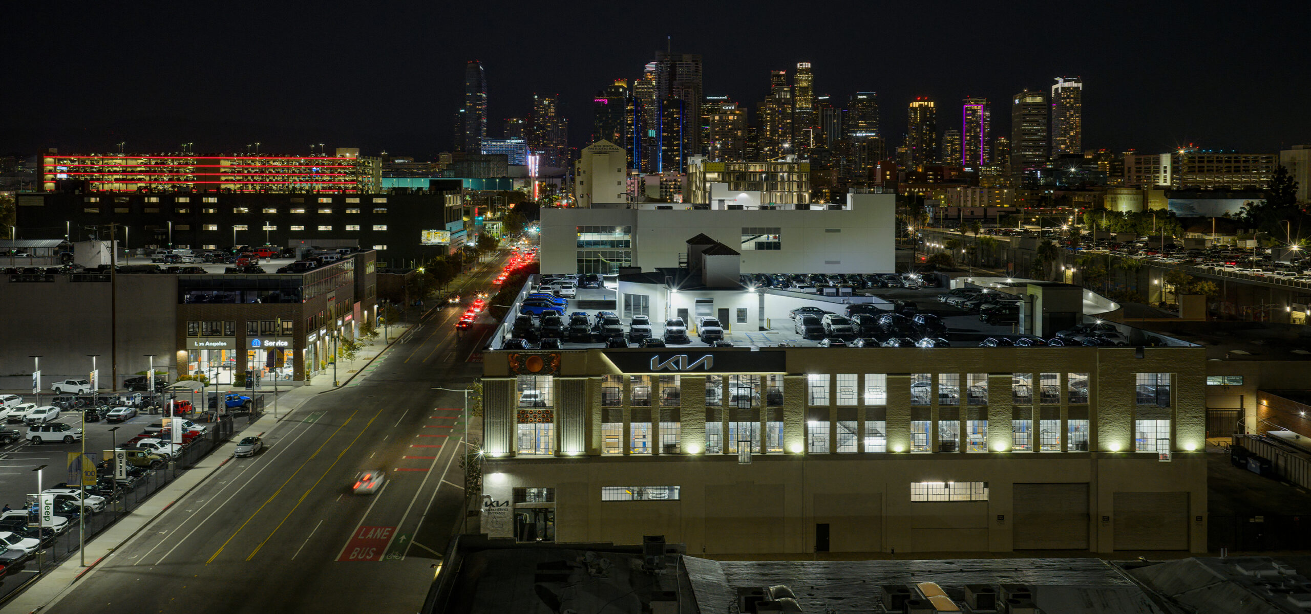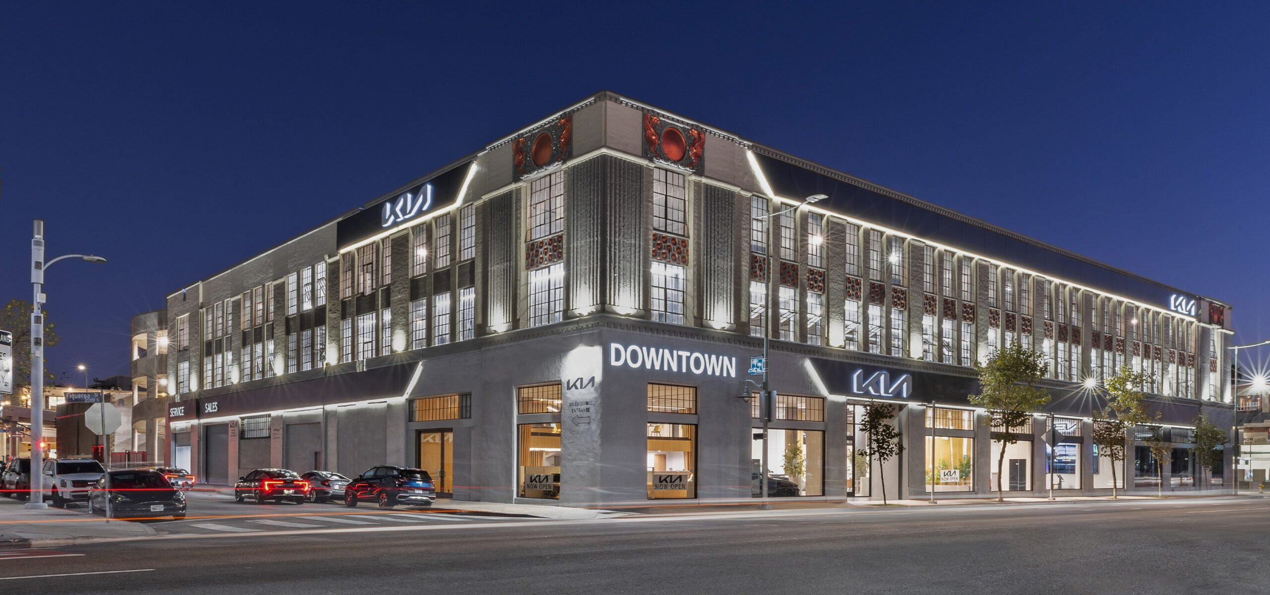 KIA DTLA transforms a century-old building on Figueroa Street into a modern, urban automotive destination. This adaptive reuse effort reimagines the 100-year-old structure as a four-story, 133,000-square-foot dealership that seamlessly blends historic character with contemporary design.