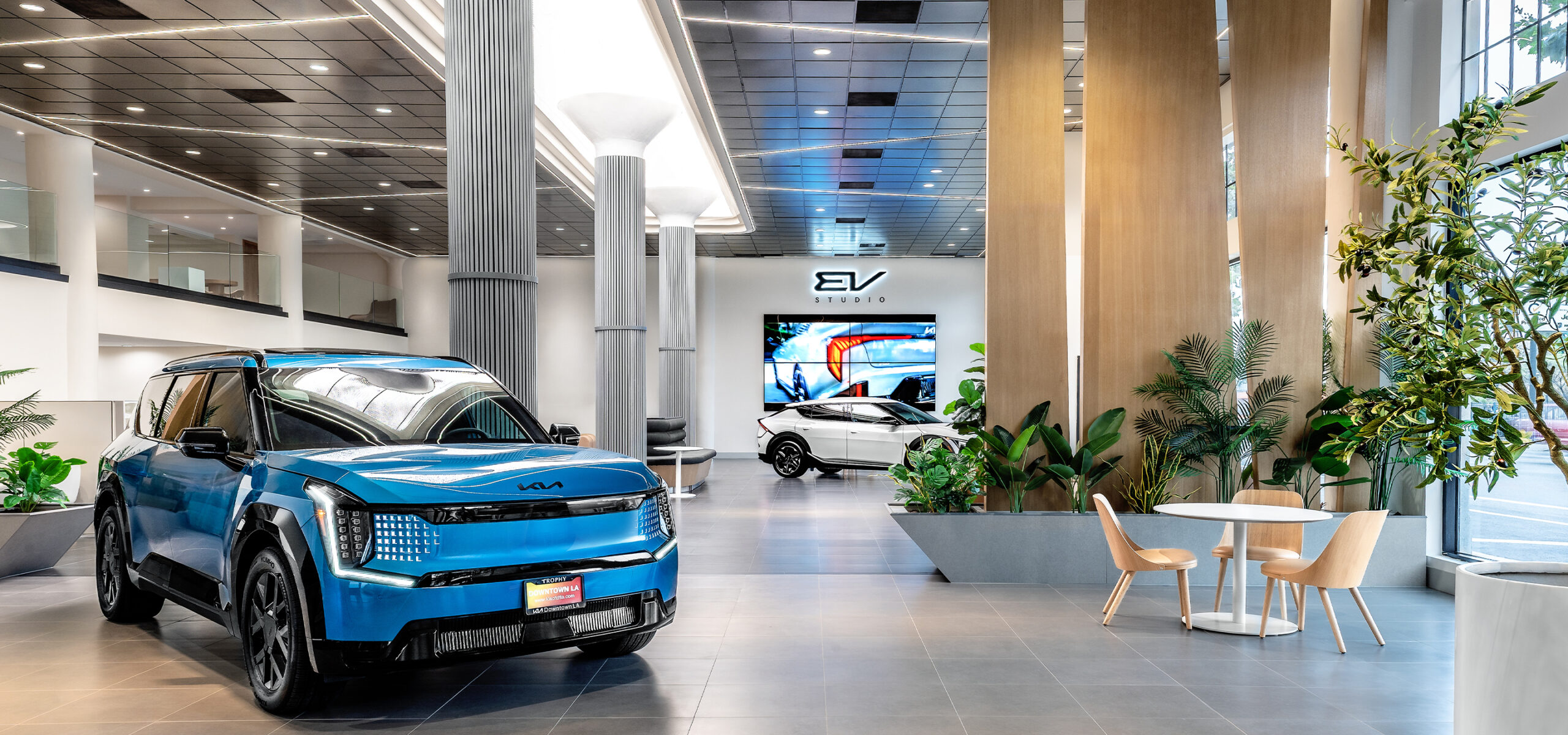 KIA DTLA has completed their conversion of a 100-year-old, 133k sf historic structure located at 2100 S. Figueroa St in downtown Los Angeles into a flagship, next-generation urban dealership. The four-story showroom and service center, designed by AO, blends contemporary automotive retail design with the building’s preserved industrial character.