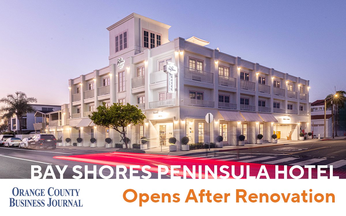 The newly opened Bay Shores Peninsula Hotel marks the second hospitality project in Orange County led by Blake Marriott and Spencer Samuelian. The business partners, also brothers-in-law, bought the former 1960s surf motel in 2021. Marriott told the Business Journal he was convinced of its potential after seeing the view from the rooftop of not only of the Balboa Peninsula but also the harbor and the Pacific Ocean. That rooftop has been renovated as one of two ocean-facing venues that can host parties.